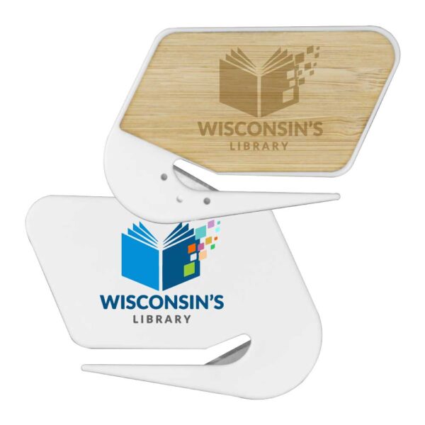 White Plastic Rectangle Letter Opener with Bamboo Trims and Branding Options.