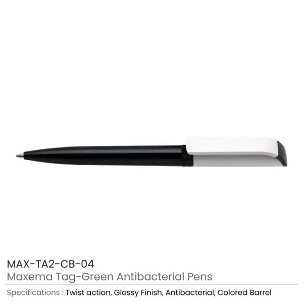 Tag Green Anti-Bacterial Pens. It has antibacterial plastic a special additive that releases silver ions so it prevents bacteria from colonizing the surface of the pen.